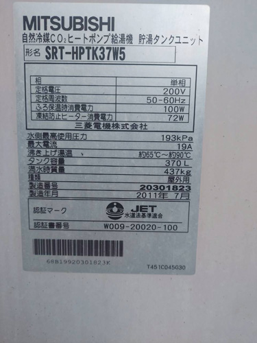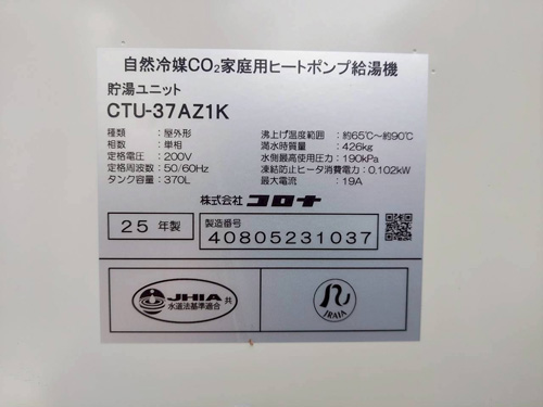 岩沼市朝日 三菱電機自然冷媒CO2ヒートポンプ給湯機 貯湯タンクユニットSRT-HPTK37W5→コロナ自然冷媒CO2家庭用ヒートポンプ給湯機ヒートポンプユニットCHP-DZ451K、貯湯ユニットCTU-37AZ1K エコキュート交換工事